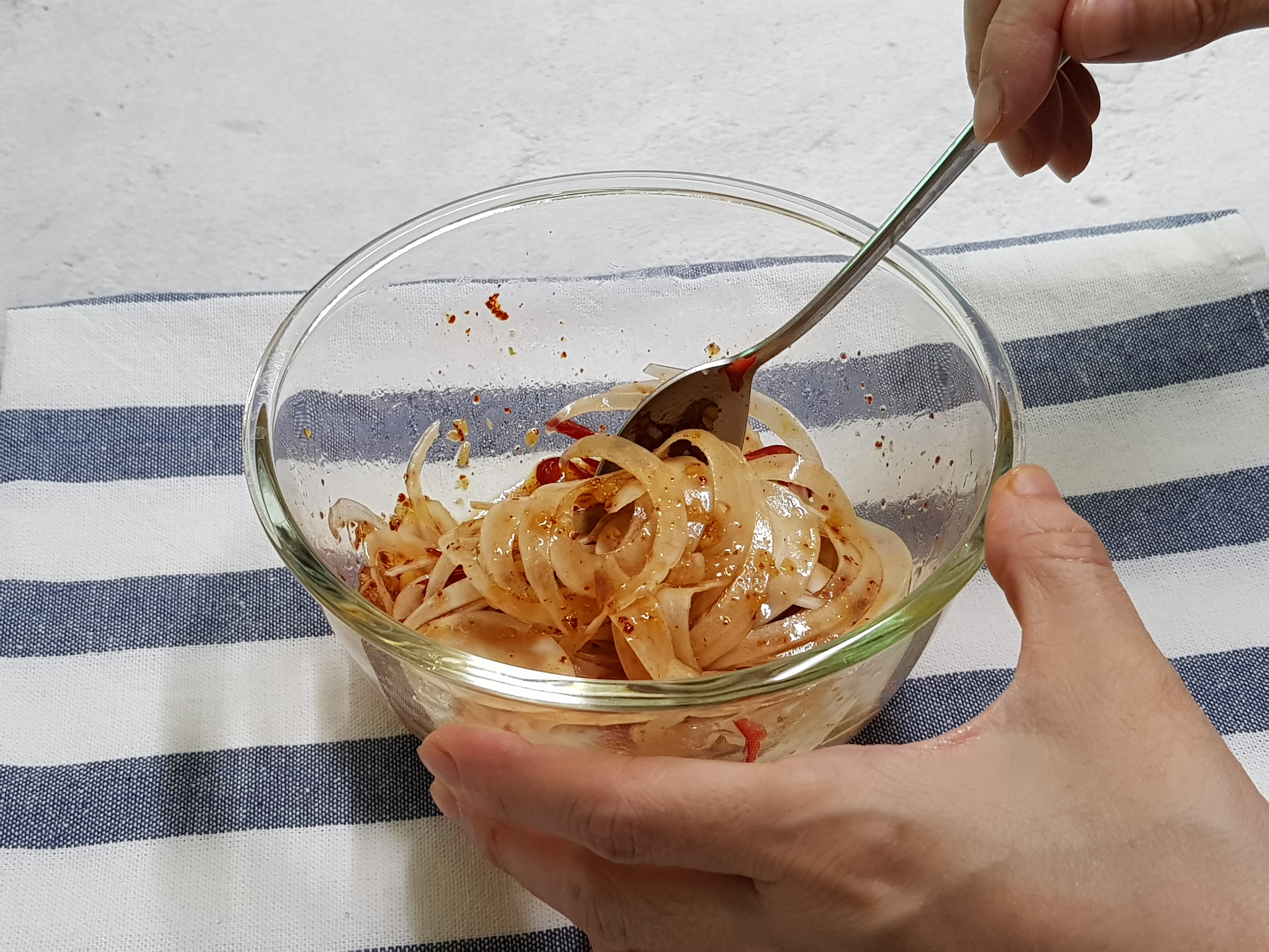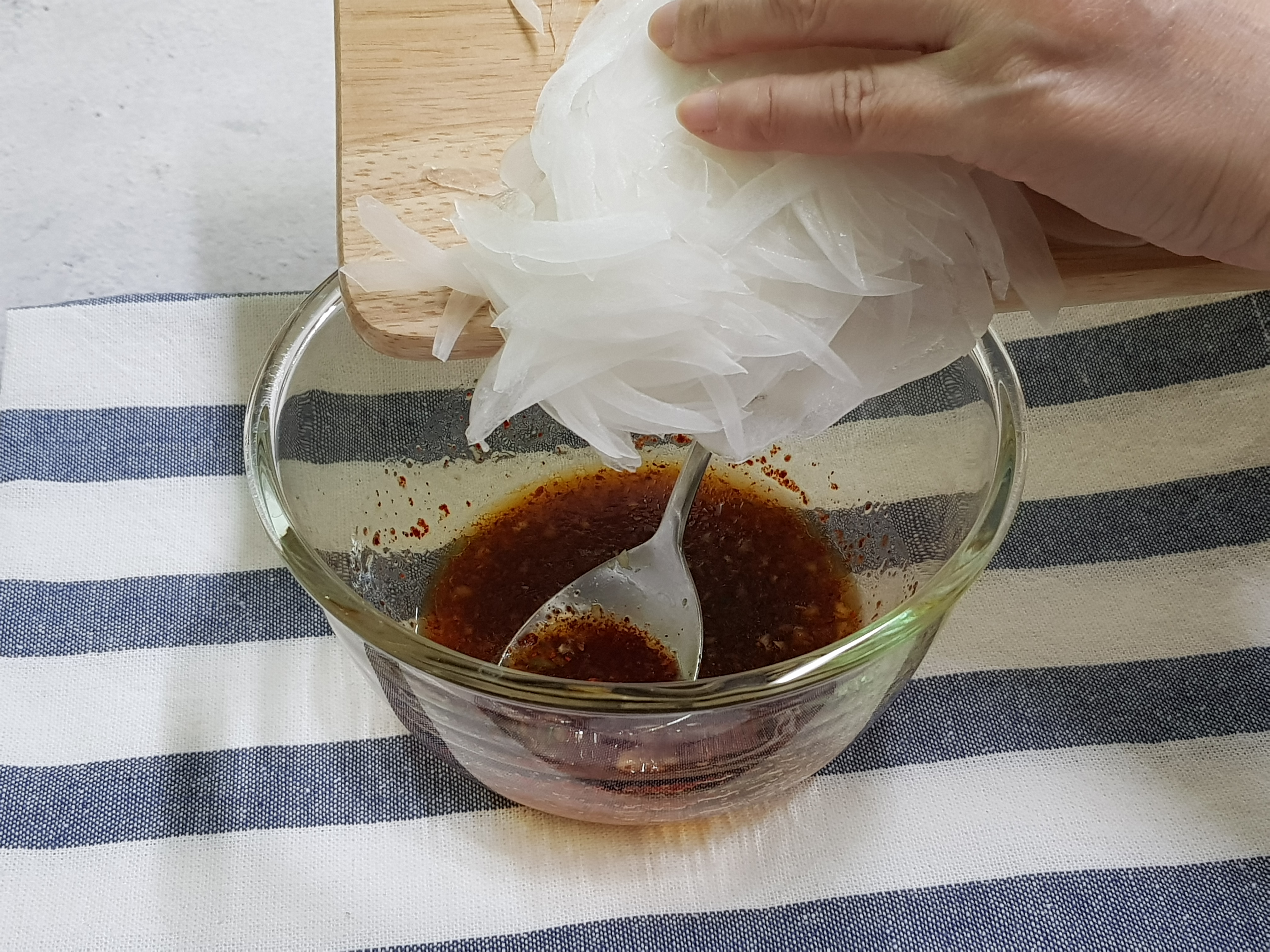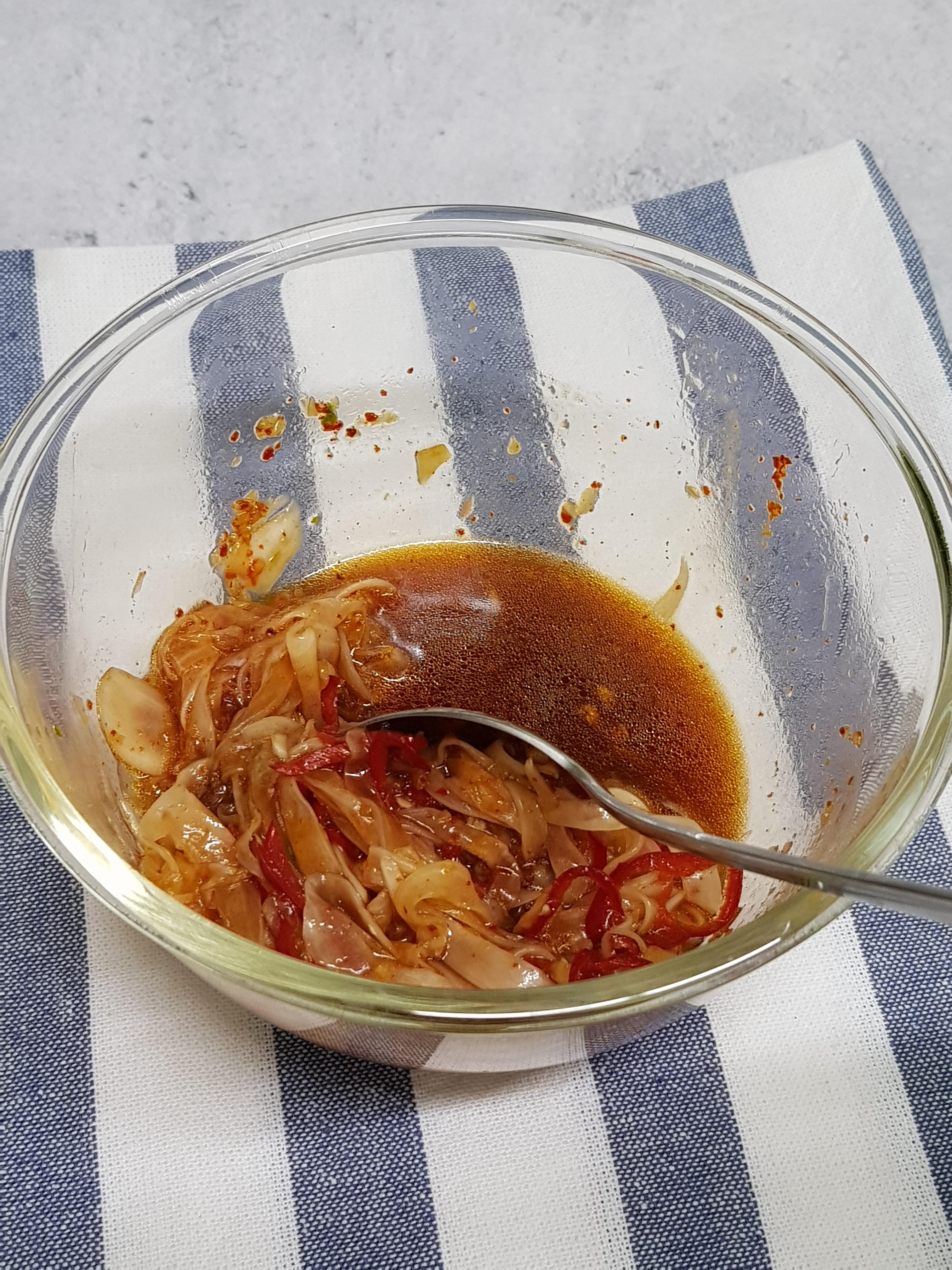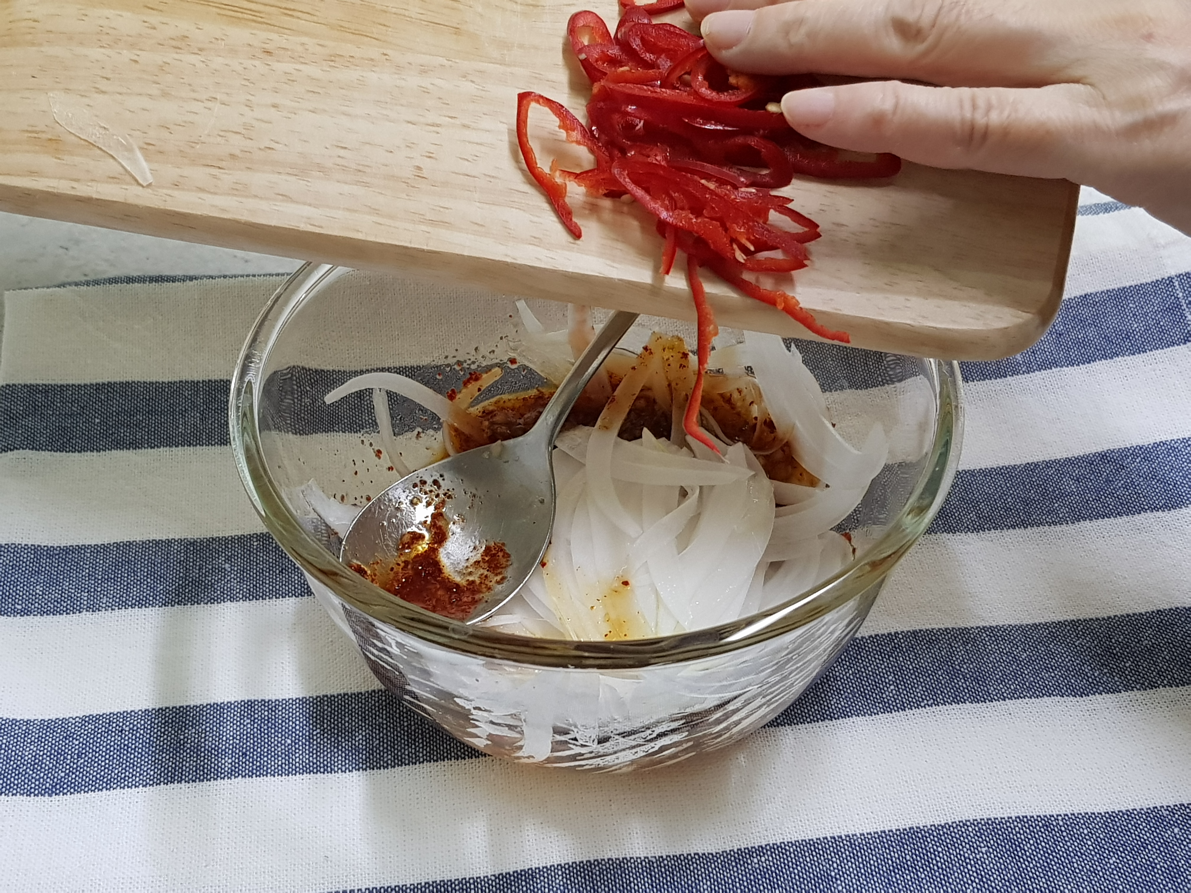 1. 만든 양념장에 썰어둔 야채들을 모두 넣어주세요