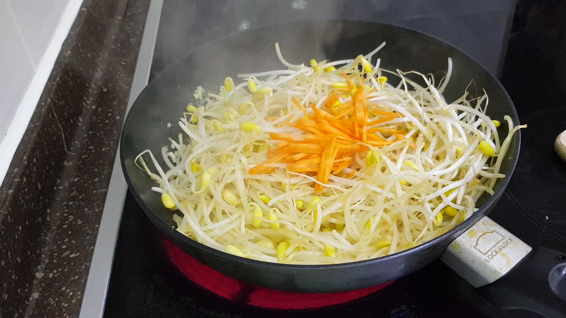 2. 콩나물, 당근 넣고 뚜껑 덮고 중불에 2~3분