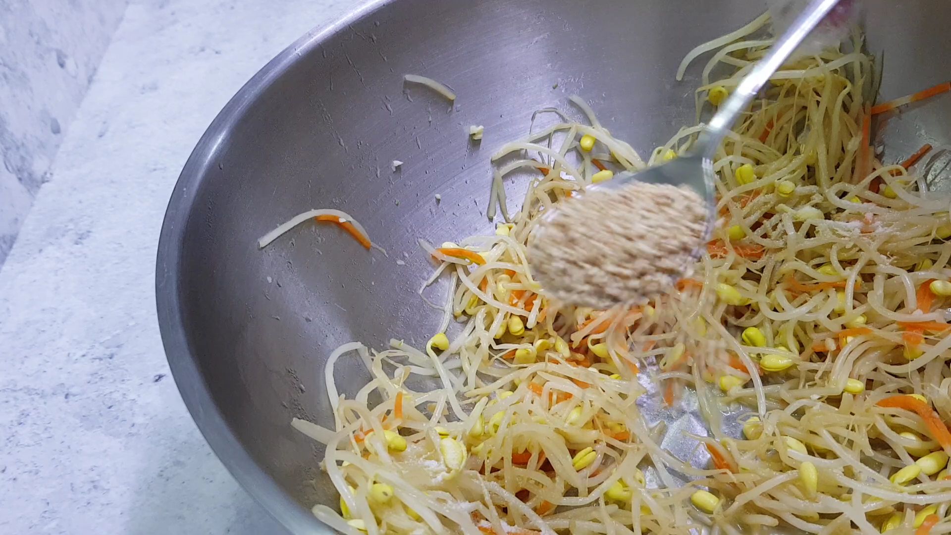 2. 콩나물과 당근을 넣고 참기름을 입히듯 30초안에 빠르게 볶아줍니다