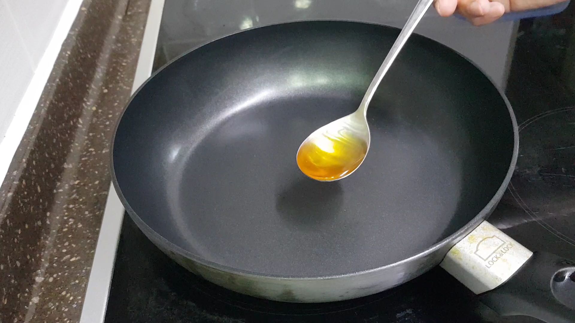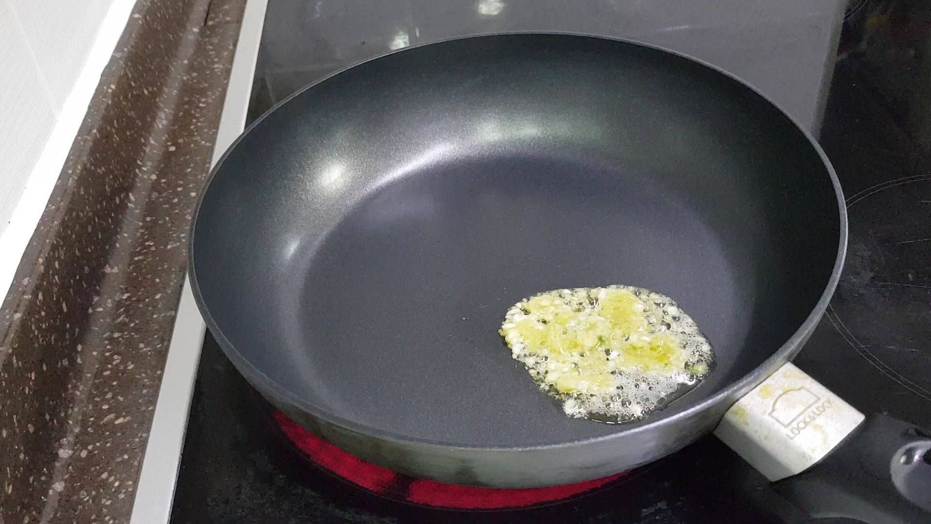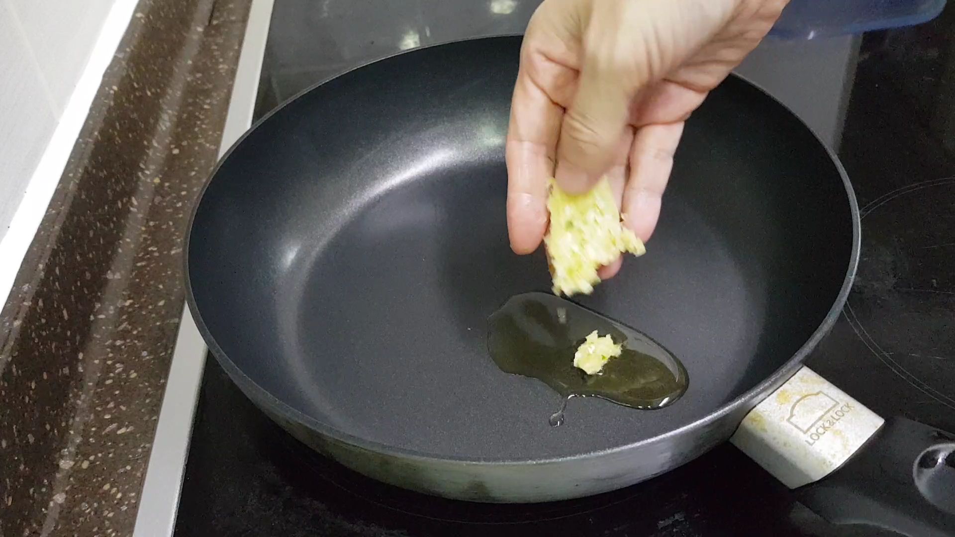 1. 참기름1스푼을 달군 후라이팬에 넣고 다진마늘 1/2스푼을 넣어줍니다.