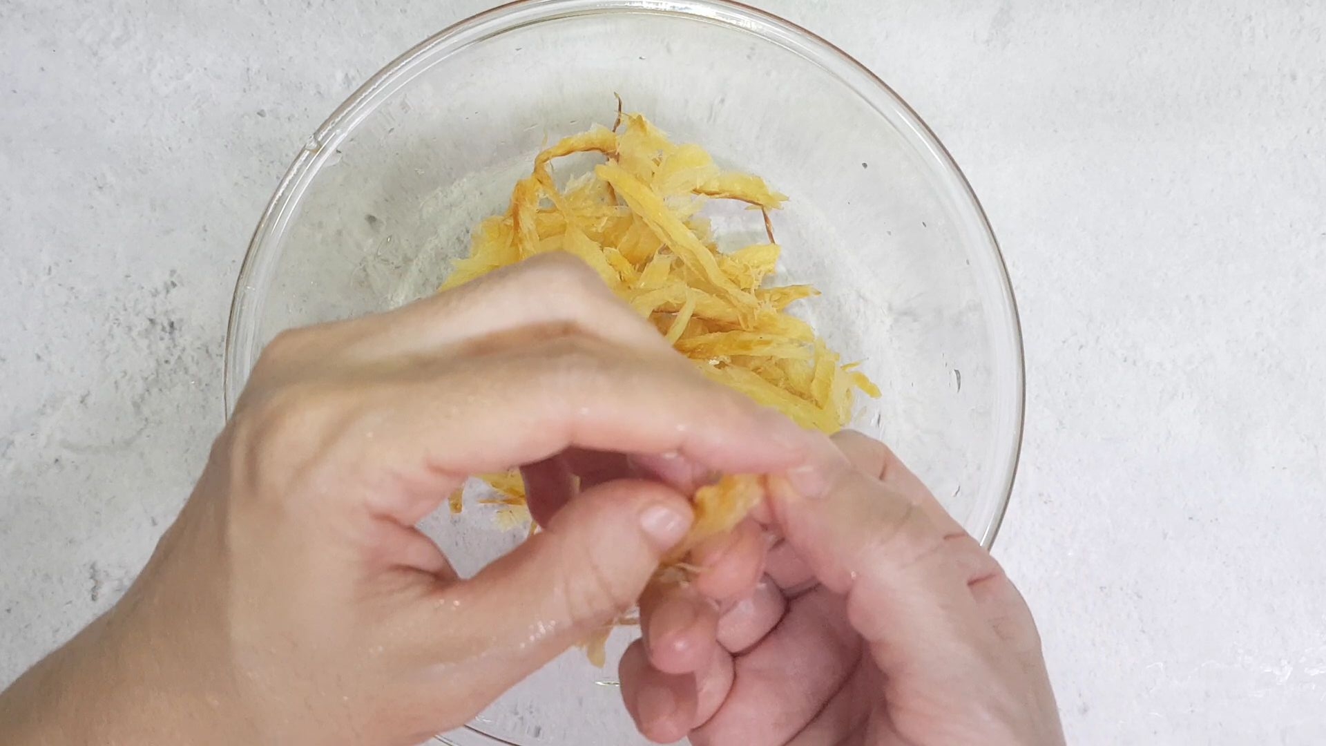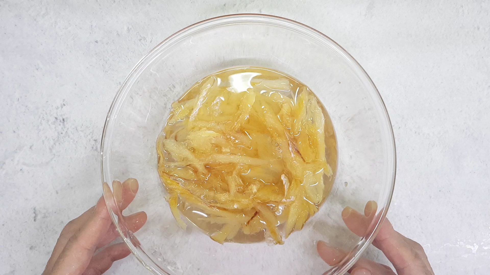 황태는 물에 담궜다가 30초내로 빼줍니다. 불어난 황태를 만지다 보면 뼈가 잡힙니다. 하나하나 뼈를 제거해줍니다.
