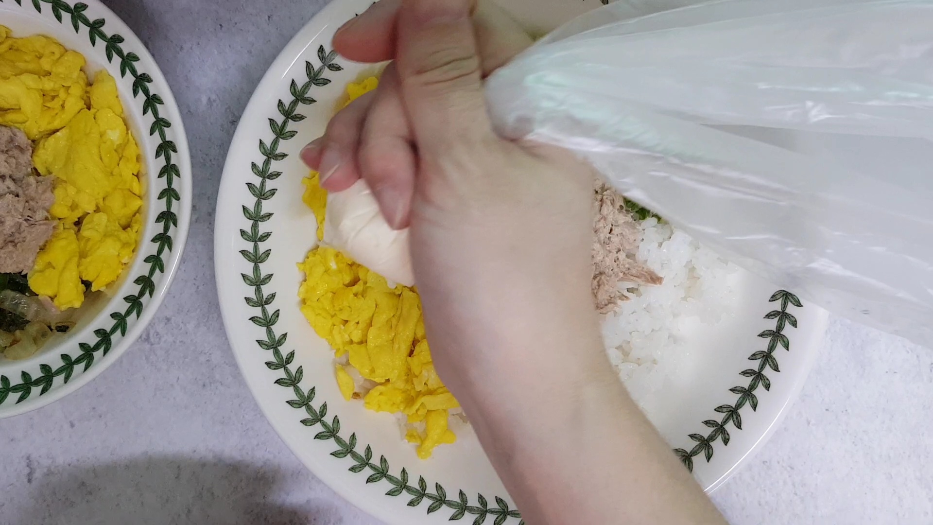 5. 파스타볼에 밥과 나머지 재료들을 넣고 짤주머니를 이용해서 마요네즈를 뿌려줍니다.